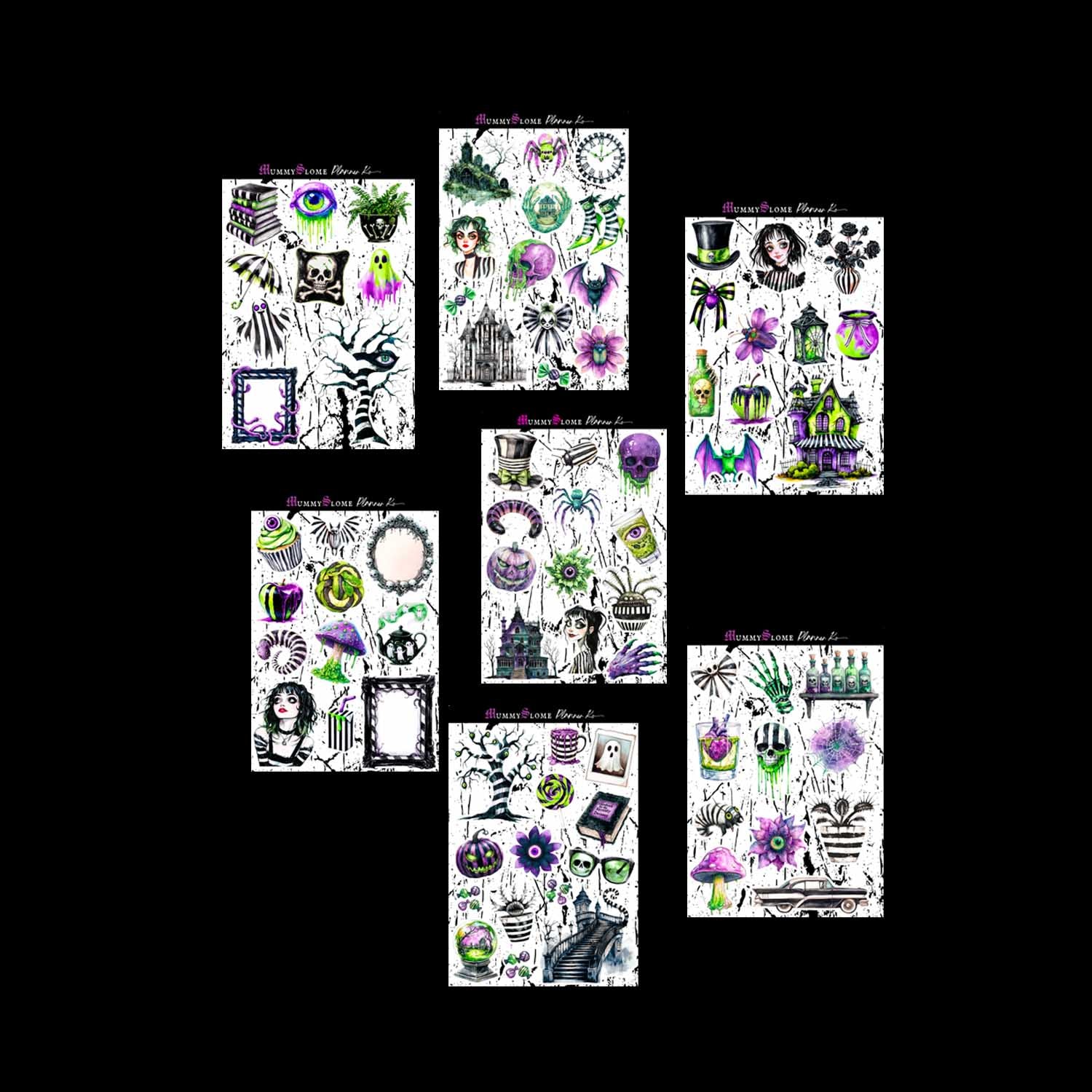 Step beyond the veil with the Afterlife Sticker Kit, a hauntingly beautiful collection of gothic and mystical artwork designed to transform your planner spreads into eerie works of art. With a palette of purples, greens, and inky blacks, this kit is equal parts haunting and enchanting—perfect for lovers of dark whimsy.