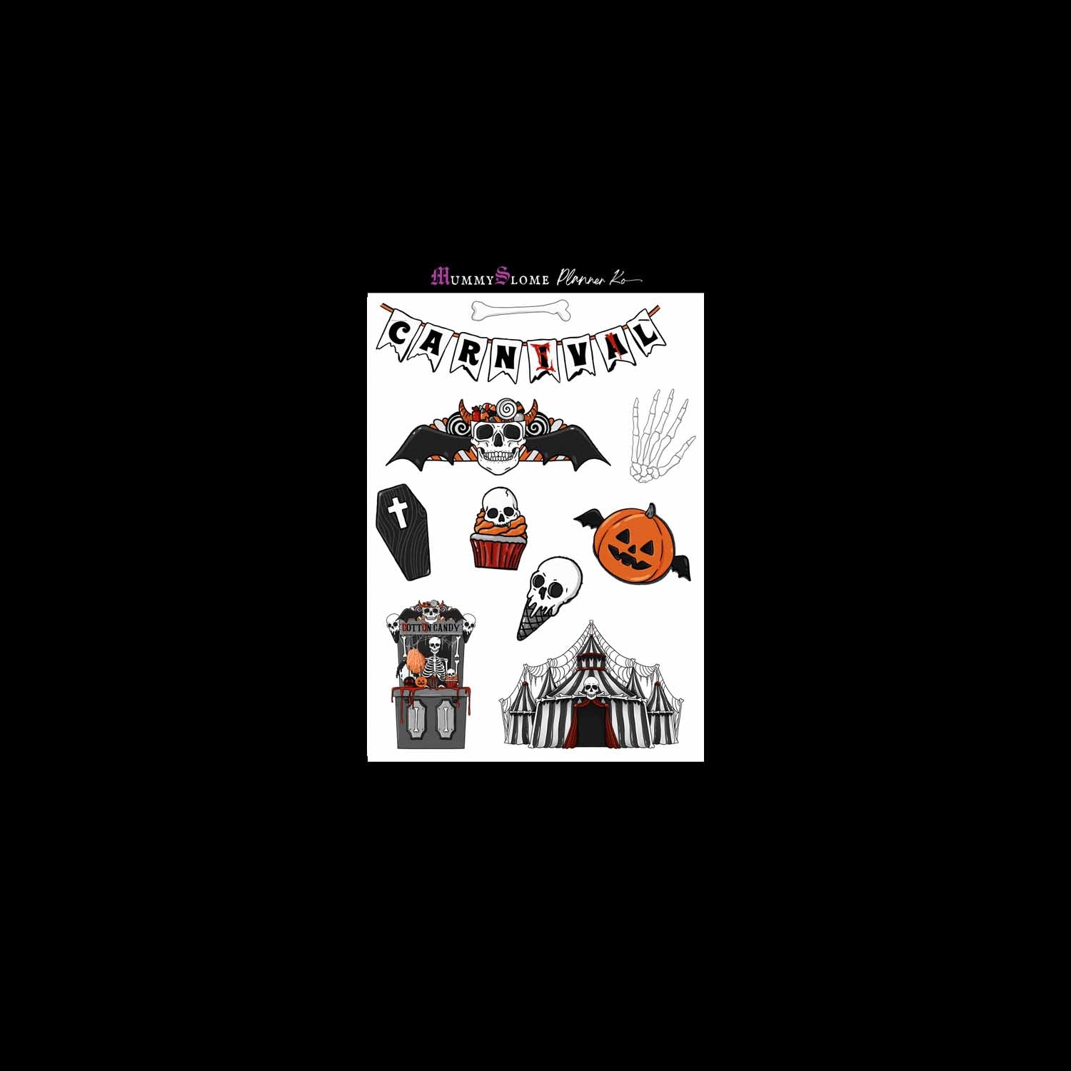 Step right up… if you dare. The Dark Carnival Delights Sticker Sheet 3 brings a spooky circus straight into your planner—complete with haunted rides, eerie snacks, and sinister sideshows. From skeleton horses to RIP popcorn, this creepy carnival has everything you need to turn your spreads into a chillingly fun spectacle.