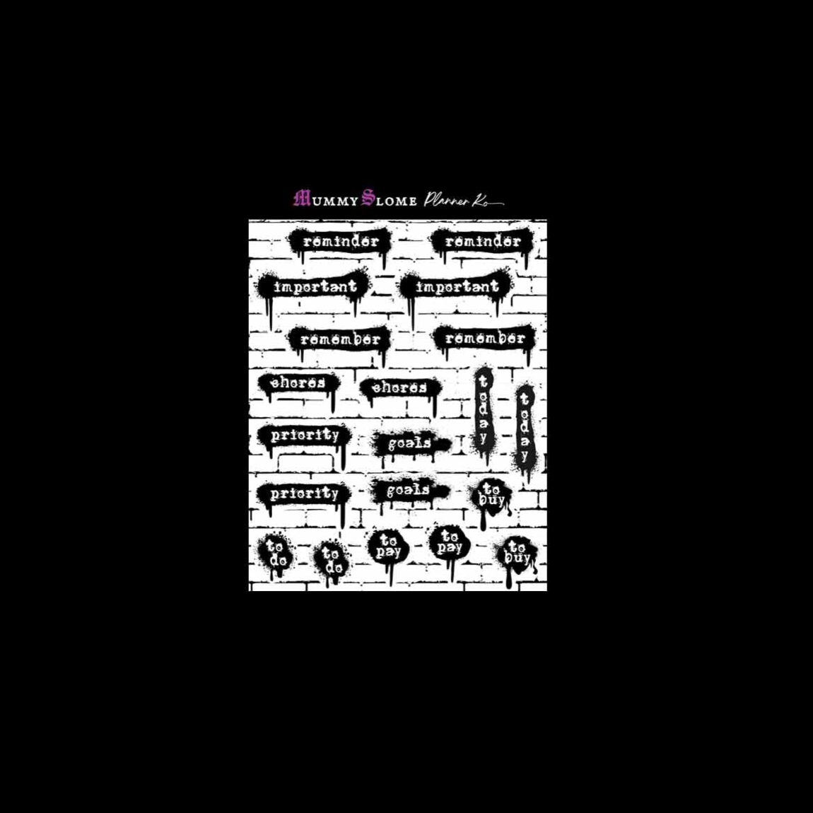 Make your planner bleed style with these dripping black label stickers that mix gothic grit with grungy function 🔥🖋️💀. From “Reminder” to “To Pay,” every word is stamped in white over a black paint splatter—perfect for tracking your life with a punk twist 🎯📓🧷. Set on a distressed brick wall, these high-impact words look like they've been spray-painted straight from your inner riot queen 🎨⚠️🧱. No pastel vibes here—just raw, messy productivity for the beautifully disorganized.